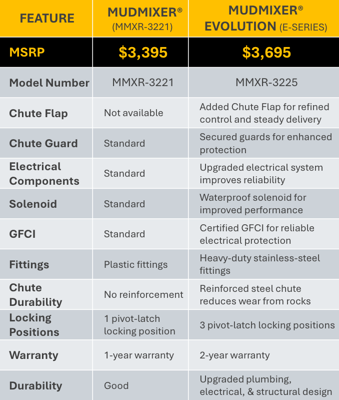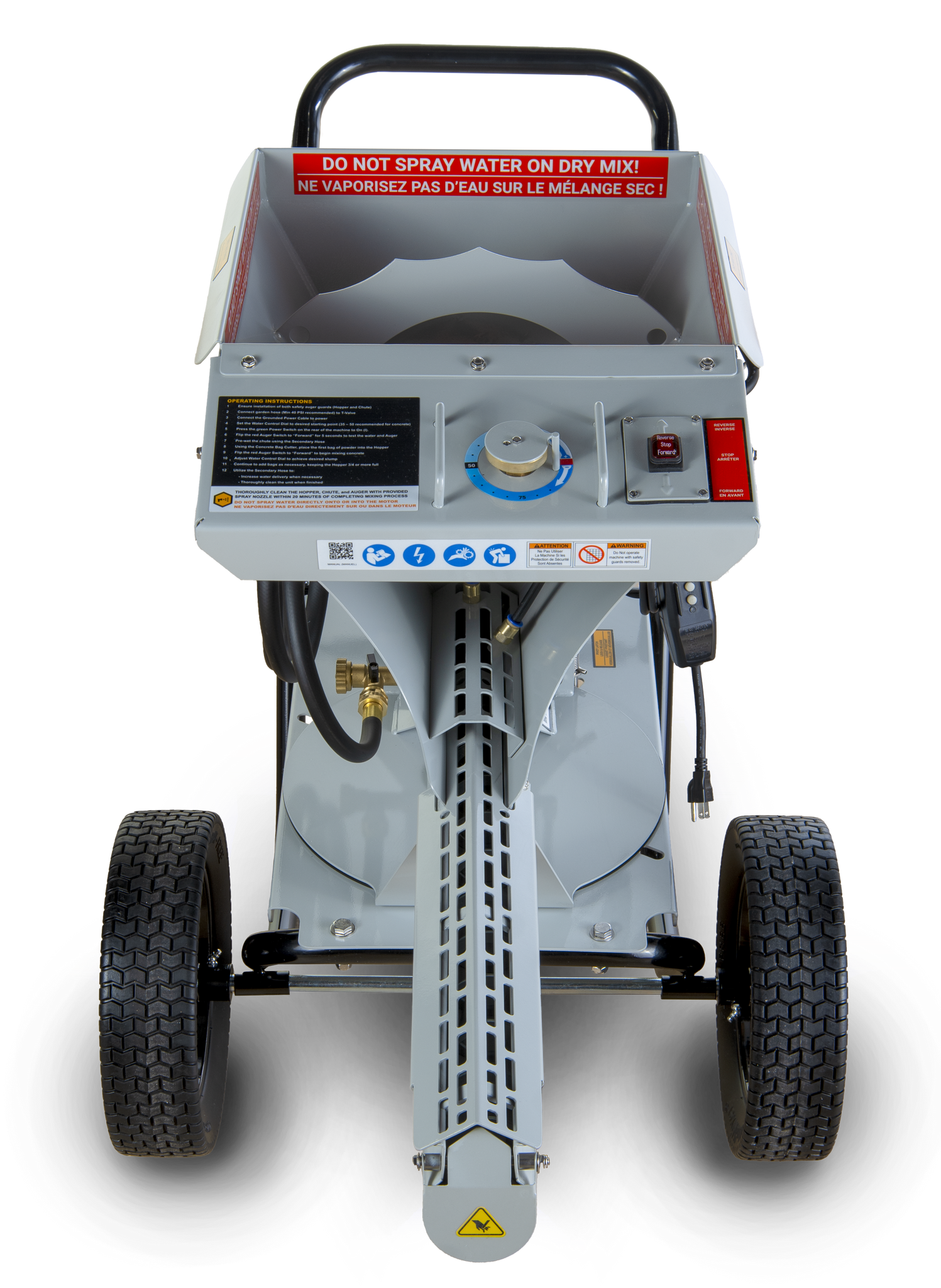 The MudMixer uses a patented continuous mixing system powered by an electric drivetrain. Dry material is loaded into the hopper, and a fully adjustable water dial controls hydration through dual internal spray nozzles. A horizontal auger then combines and pushes the material through the chute, delivering a consistent flow of mixed concrete, mortar, stucco, grout, or poolkrete. As long as you keep feeding the hopper, the MudMixer keeps mixing and pouring.